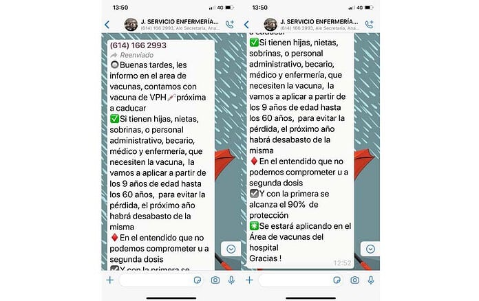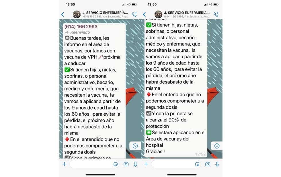 En el área de vacunas del Hospital General -les avisa el enfermero- tienen la del virus del papiloma humano (VPH) próxima a caducar, por lo que invita a los empleados a que lleven a sus hijas, nietas, sobrinas y en general a todo el personal a aprovechar ese insumo.