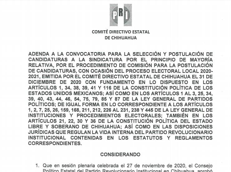 La adenda señala que la fecha para el registro de aspirantes no será el 17 sino el 23 de enero en las instalaciones del Comité Directivo Estatal.