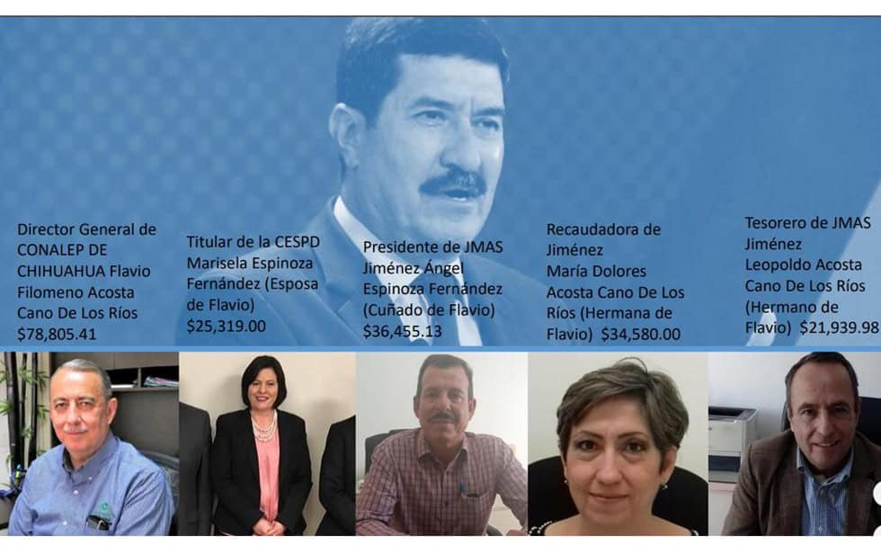 En Jiménez, donde los Acosta tienen sentados sus reales, el presidente de la Junta Municipal de Agua y Saneamiento es Ángel Espinoza Fernández, cuñado de Flavio Filomeno, cuyo hermano Leopoldo Acosta es el tesorero de la misma dependencia. Mal pagados no están ellos.