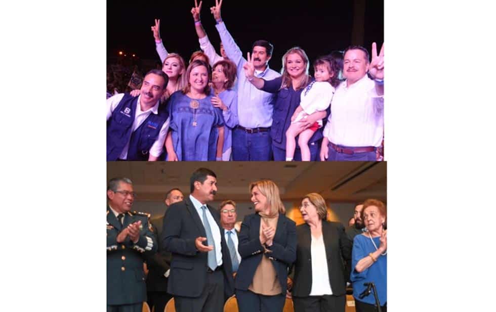En 2016, Corral y Maru hacen la señal de la victoria, la noche misma de los comicios, rodeados de los panistas que contribuyeron decisivamente a su triunfo. Se inauguraba una era de colaboración.