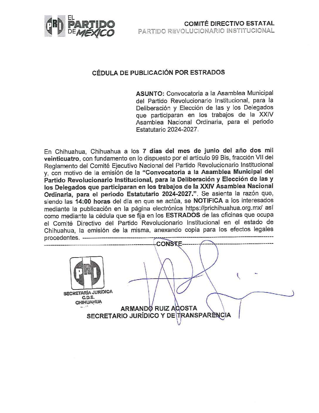 Cedula de la Convocatoria a la Asamblea Municipal del Partido Revolucionario Institucional, para la Deliberación y Elección de las y los Delegados que participaran en los trabajos de la XXIV Asamblea Nacional Ordinaria, para el periodo Estatutario 2024-2027.
