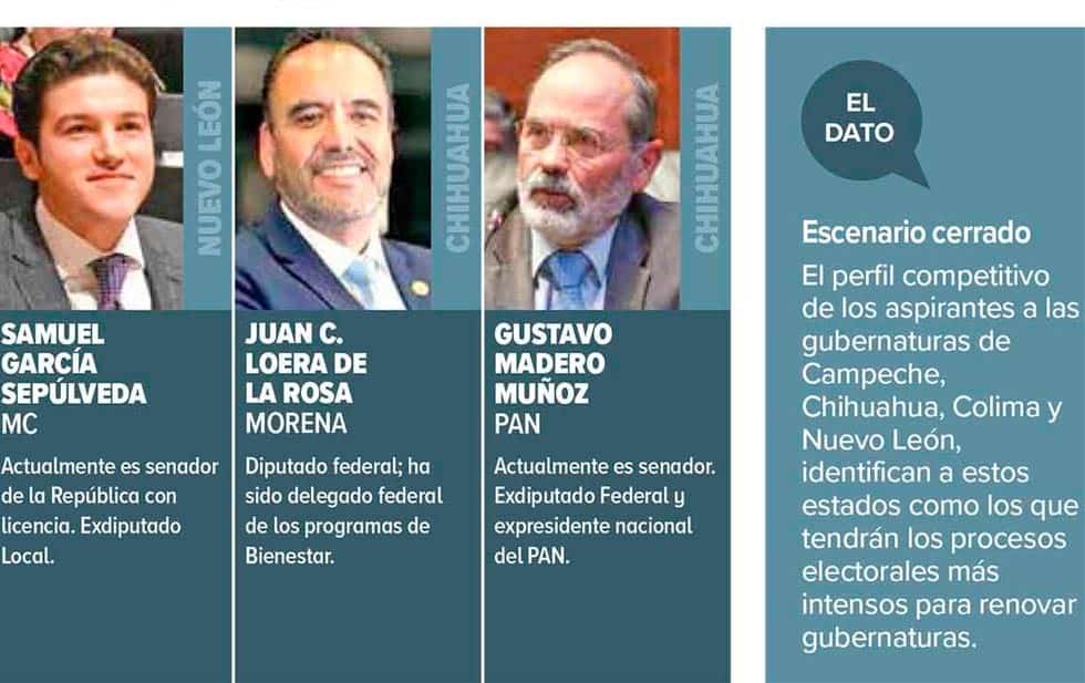 Ciudad de México.- Morena y la alianza PAN-PRI-PRD se preparan para renovar 15 gubernaturas, cuatro de las cuales se perfilan por ahora de reñida competencia: Campeche, Chihuahua, Colima y Nuevo León.