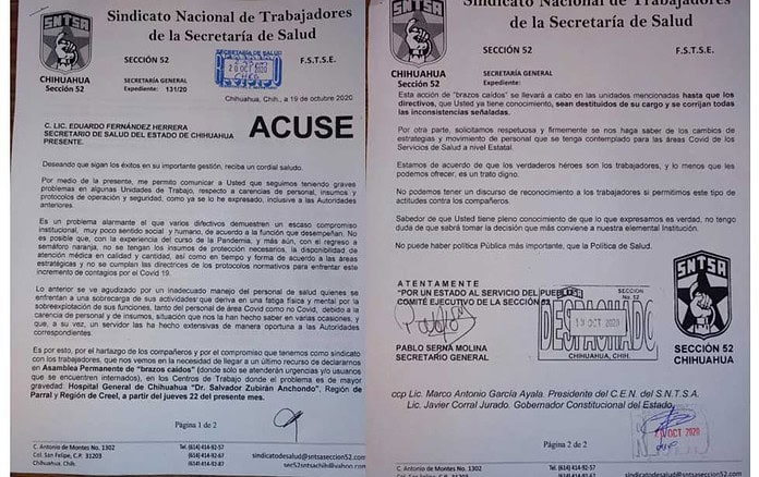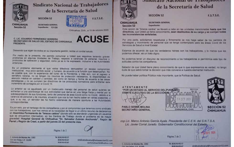 En el momento más crítico de la pandemia, precisamente el personal del Hospital General de Chihuahua, de un centro de salud en Creel y las oficinas de la Secretaría de Salud en Parral se instalaron en plantón de brazos caídos. En Juárez habrá protesta este viernes.