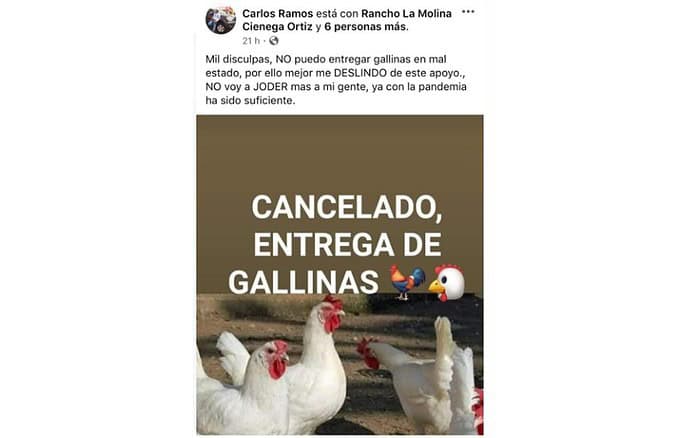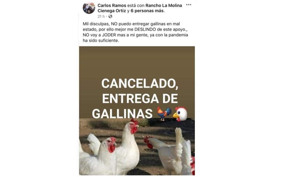 “Mil disculpas. No puedo entregar gallinas en mal estado. Por ello mejor me deslindo de este apoyo. No voy a joder más a mi gente, ya con la pandemia es suficiente”.
