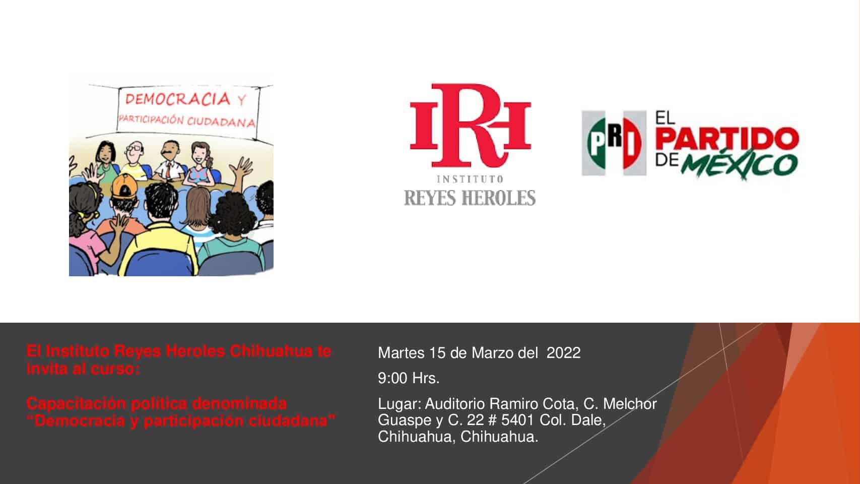 El Instituto Reyes Heroles invita a todos los simpatizantes y militantes al curso “DEMOCRACIA Y PARTICIPACION CIUDADANA“, el cual será impartido el día 15 de Marzo del 2022 a las 09:00 hrs. en el auditorio “Ramiro Cota”, del Comité Directivo Estatal.