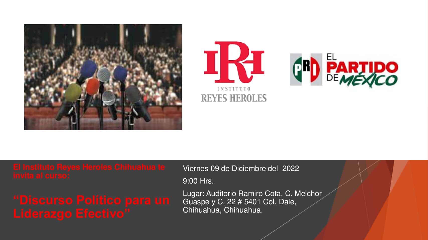 El Instituto Reyes Heroles invita a todos los simpatizantes y militantes priístas al curso: Discurso Político para un Liderazgo Efectivo, el cual será impartido el día 09 de Diciembre del 2022 a las 09:00 hrs. En el auditorio “Ramiro Cota”, del Comité Directivo Estatal del P.R.I.