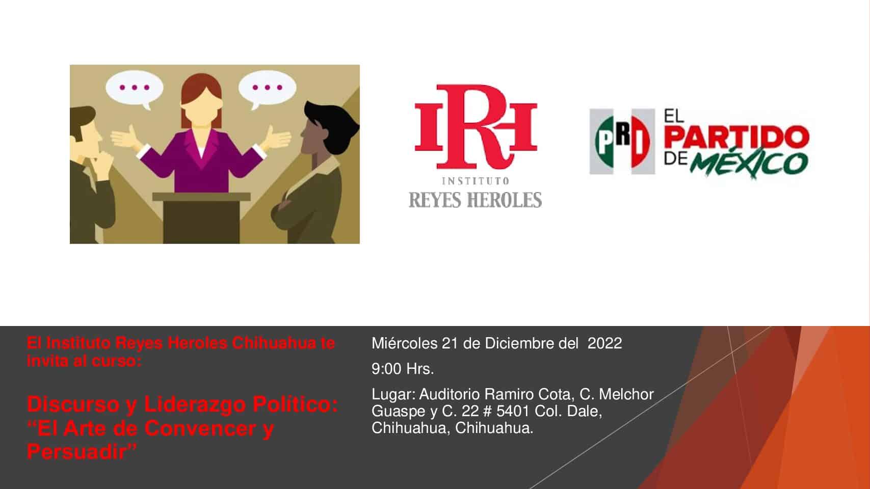 El Instituto Reyes Heroles invita a todos los simpatizantes y militantes priístas al curso de Discurso y Liderazgo Político: “El Arte de Convencer y Persuadir”, el cual será impartido el día 21 de Diciembre del 2022 a las 09:00 hrs. En el auditorio “Ramiro Cota”, del Comité Directivo Estatal del P.R.I.