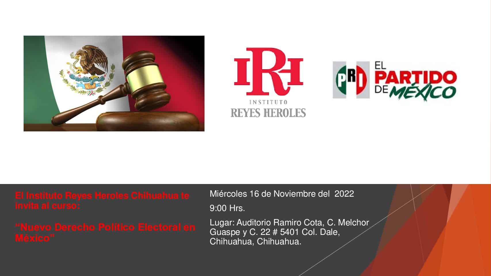 El Instituto Reyes Heroles invita a todos los simpatizantes y militantes priístas al curso: “Nuevo Derecho Político Electoral en México”, el cual será impartido el día 16 de Noviembre del 2022 a las 09:00 hrs. En el auditorio “Ramiro Cota”, del Comité Directivo Estatal del P.R.I.