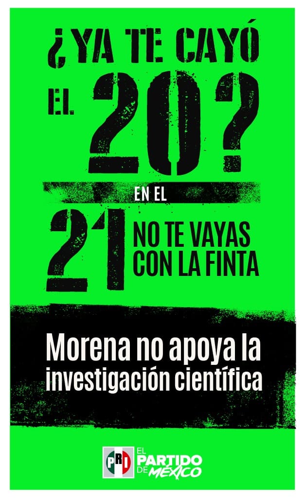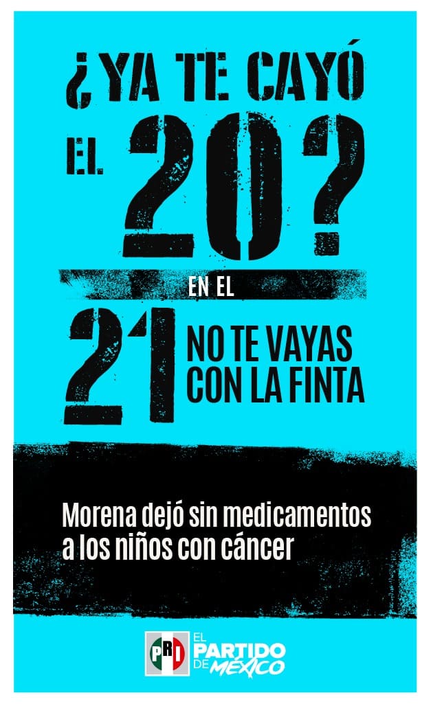 El Presidente del tricolor, Alejandro Moreno anotó que hoy, más que nunca, es evidente la falta de resultados y es claro que nuestro país ha perdido el rumbo. En una campaña en redes sociales con el hashtag: #YaTeCayóEl20, el PRI cuestionó la falta de resultados del gobierno federal en materia de seguridad y economía; así como en atención a las mujeres y a los niños con cáncer.