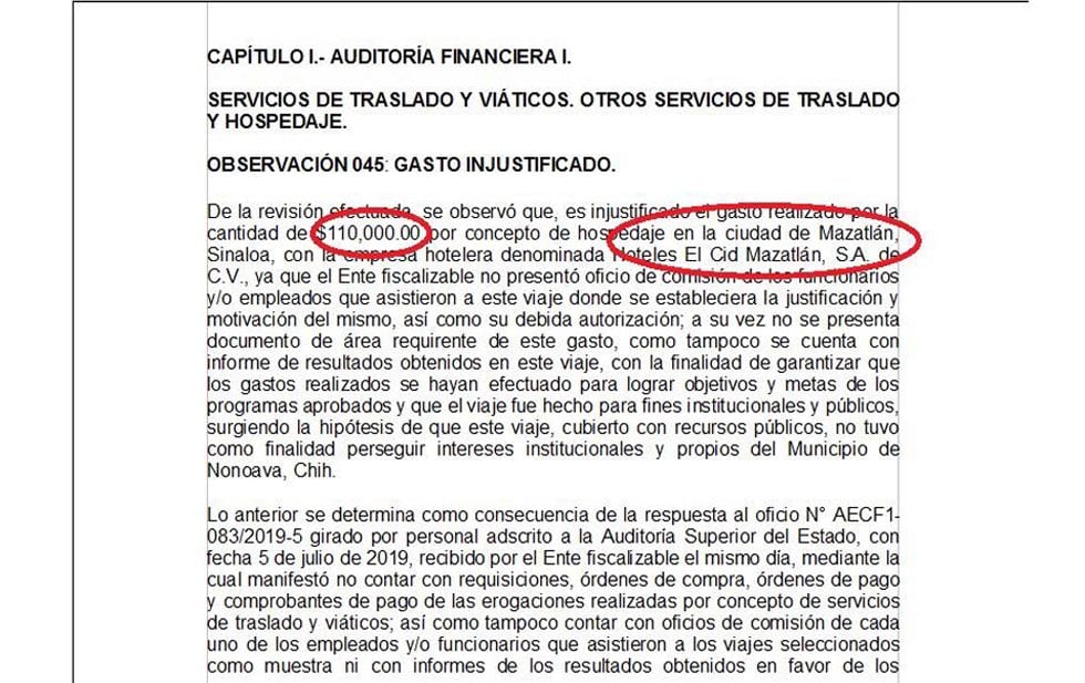 Ahí estaban las facturas clarísimas de la cadena hotelera, pero ella se hizo la occisa. “(…) no se presenta documento de área requirente de este gasto, como tampoco se cuenta con informe de resultados obtenidos en este viaje, con la finalidad de garantizar que los gastos realizados se hayan efectuado para lograr objetivos (…) surgiendo la hipótesis de que este viaje, cubierto con recursos públicos, no tuvo como finalidad perseguir intereses institucionales y propios del municipio de Nonoava”, concluyeron los auditores.
