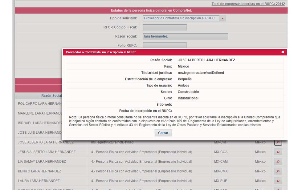 Dice la imagen que le mostramos en nuestra edición digital, en la nota localizada al calce, que “la persona física o moral consultada no se encuentra inscrita en el RUPC -Registro Único de Proveedores y Contratistas-, por favor solicitarle la inscripción a la Unidad Compradora que le adjudicó algún contrato de conformidad con lo dispuesto en el artículo 105 del Reglamento de la Ley de Adquisiciones, Arrendamientos y Servicios del Sector Público y el artículo 43 del Reglamento de la Ley de Obras Públicas y Servicios Relacionados con las mismas”.