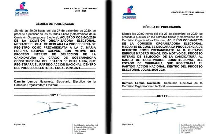 A través de su sitio oficial el organismo panista público los oficios en los que destaca la procedencia del registro del senador con licencia, Gustavo Madero, así como de la alcaldesa de Chihuahua, Maru Campos.