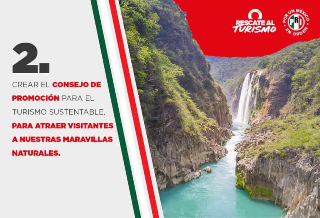2. Crear el Consejo de Promoción para el Turismo Sustentable. México puede convertirse en un destino importantísimo para el turismo sustentable, por eso proponemos crear el Consejo de Promoción para el Turismo Sustentable, que promocionará nuestras bellezas naturales y el cuidado al medio ambiente.
