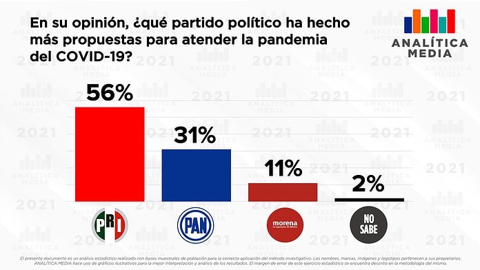 El estudio señala que a la pregunta: en su opinión, ¿qué partido político ha hecho más propuestas para atender la pandemia del COVID-19?, el 56 por ciento de los encuestados respondió que el PRI; 31, PAN; 11, Morena y el 2 por ciento “no sabe”.