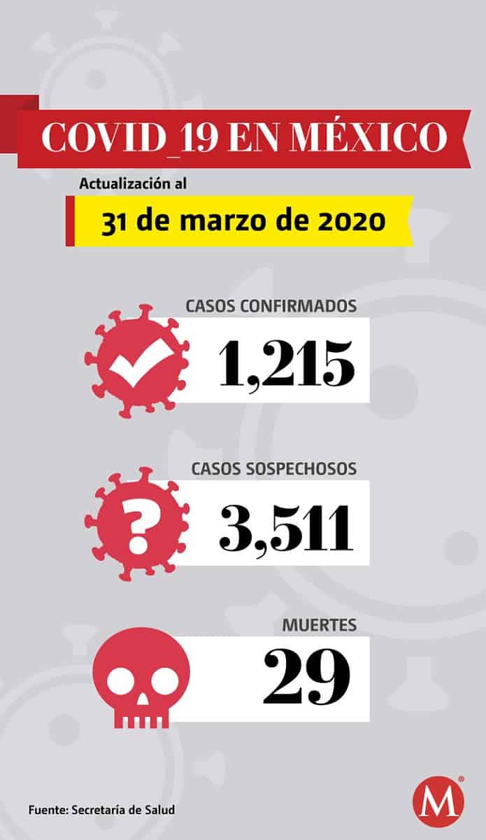 José Luis Alomía, director general de Epidemiología, dio a conocer este martes que ya son 29 los decesos por Covid-19 en México, y señaló que hay mil 215 casos confirmados en el territorio nacional.