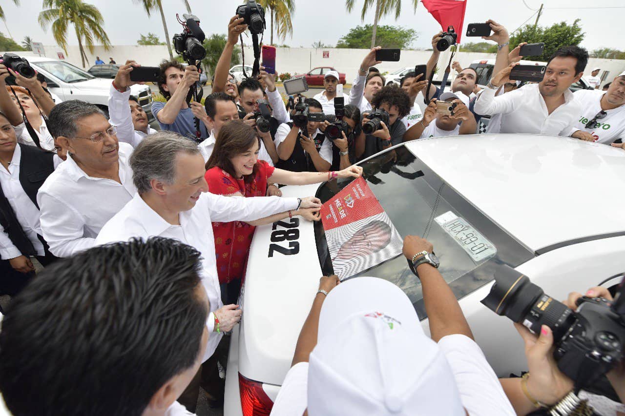 El candidato de la coalición Todos por México, José Antonio Meade, arribó esta mañana al Puerto de Acapulco acompañado de su esposa Juana Cuevas, para continuar con su gira proselitista por todo el país. A su llegada, fue recibido con música, baile y ambiente festivo por decenas de taxistas de este centro turístico, quienes le colocaron un collar de flores, se sumaron a su campaña y ofrecieron sus unidades para portar en éstas calcomanías con el logotipo oficial del aspirante presidencial.